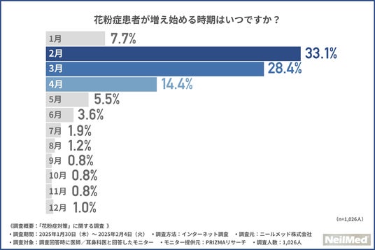花粉症患者が増え始める時期は、スギ花粉の飛散が本格化する「2月」から「3月」が多く、耳鼻科医、医師ともに花粉症患者は年々増えていると思う方が非常に多いようです。