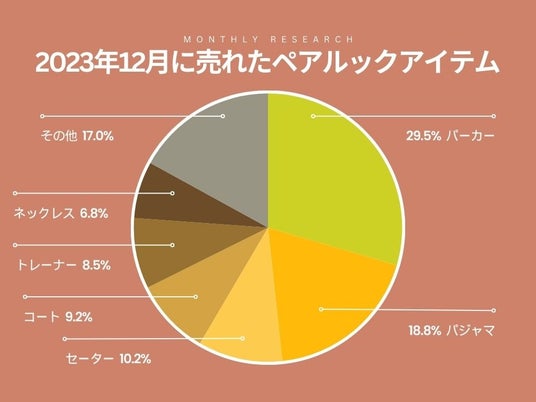 Fulmoペアルックの商品をカテゴリごとに多数取り揃える、ペアルック専門通販サイトPairl 2023年12月にどのようなカテゴリの商品が購入されたか、当社独自のデータをもとに調査