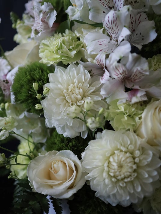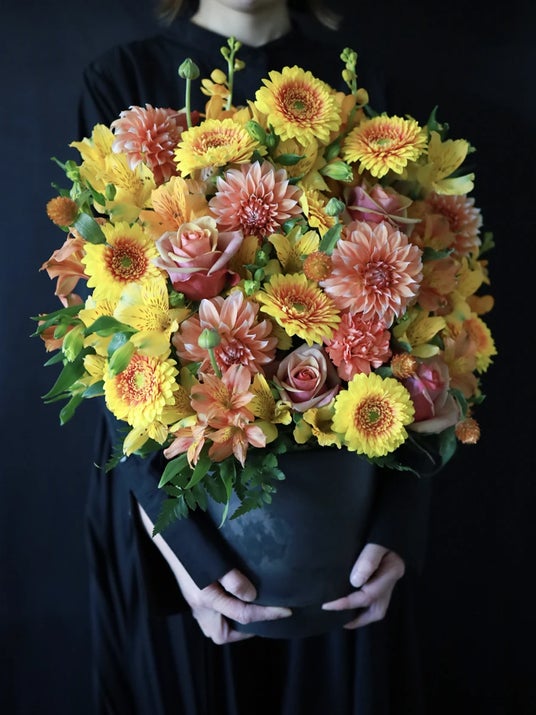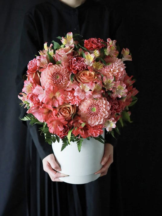 フォーマルな佇まいに可愛らしさを添え、モダンな空気感を感じさせるアレンジメント。ダリアを主役に据えた華やかな構成と、誰もが親しみやすい柔らかなビジュアルが特長です。