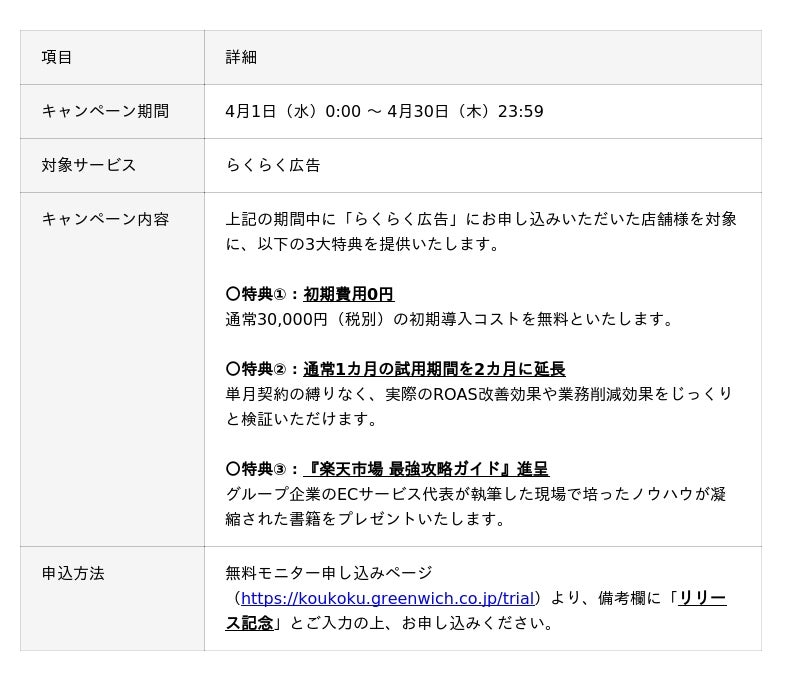 https://koukoku.greenwich.co.jp/ 2025年4月30日(水)までに「らくらく広告」をお申し込み、ご契約いただいた店舗様を対象に、初期費用が無料になるなどの3大特典を提供いたします。