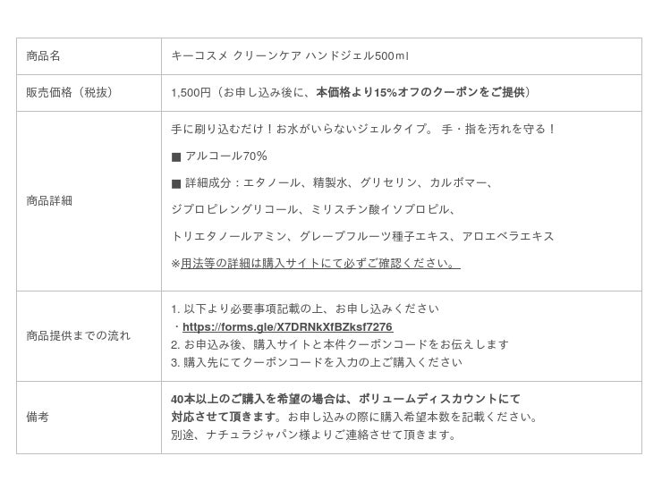 https://logikura.jp )」を提供する株式会社ロジクラ(東京都港区、代表取締役 長浜佑樹)は、COVID-19の影響により中長期的な感染症対策が求められている物流現場を支援するため、株式会社ナチュラジャパン(東京都大田区、代表取締役 平賀俊一)と連携し、コロナ対策ハンドジェルを物流従事者 *1 に限り特別価格で提供を開始いたします。