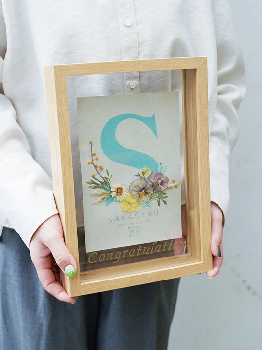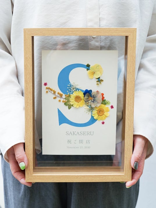 開業や周年のお祝いには、会社のイニシャルを押し花で彩り、大切な節目をお祝いする贈り物としてご活用いただけたら嬉しいです。