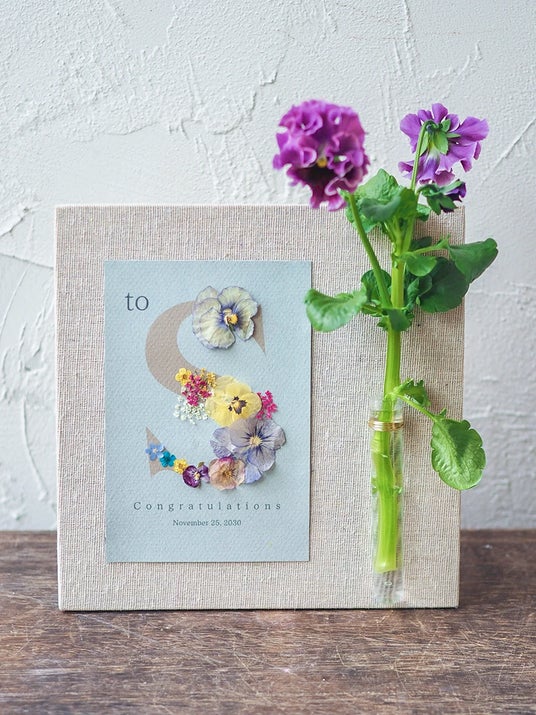 押し花をデコレーションしたイニシャルカードに、一輪のお花を添えて、お届けします。押し花・一輪のお花はご希望の雰囲気でご用意いたします。一輪挿しは繰り返し使うことが可能なので、長く飾っていただけるアレンジです。