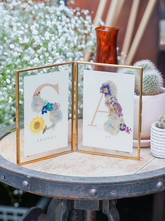 イニシャルに押し花をデコレーションした高級感のある真鍮フレームのアレンジ。