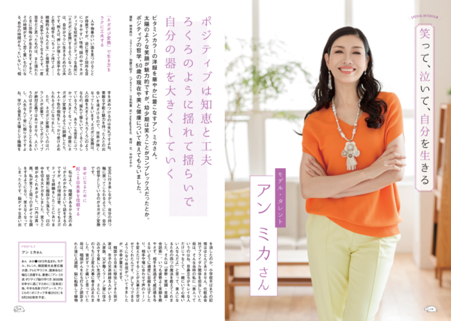 スペシャルインタビュー/アン ミカさんビタミンカラーの洋服を華やかに着こなすアン ミカさん。太陽のような笑顔が魅力的ですが、幼少期は笑うことがコンプレックスだったとか。ポジティブの哲学、50歳の現在や美と健康について教えてもらいました。