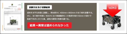 国内検査機関にて160kg超の静的耐荷重テストに合格済み。公式表記は安全性を重視し、メイン積載部80kg/リア部30kg=総耐荷重110kgとしています。