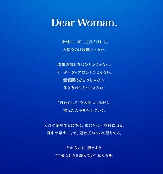 「Dear Woman.」は、 “自分の人生を自分で選び続ける女性”をテーマに、多様な分野で活躍する女性や企業の想い・ストーリーを可視化し、次世代の女性たちへエールを届けるプロジェクトです。