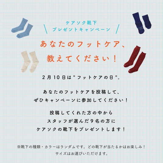 投稿していただいた方の中からスタッフが選んだ9名の方に、ケアソクの靴下をいずれか1足プレゼントします。(※)