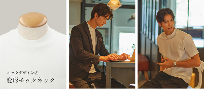 <変形モックネック>ジャケットとの相性が良い変形モックネックは、後ろ襟にかけてリブがより高くなるように設計しています。