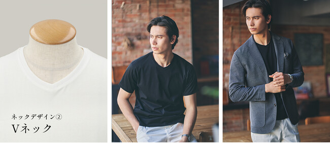 <Vネック>大人っぽさと解放感を演出するVネックは襟元の開きを控えめにすることできっちりとした大人な雰囲気に仕上げてます。