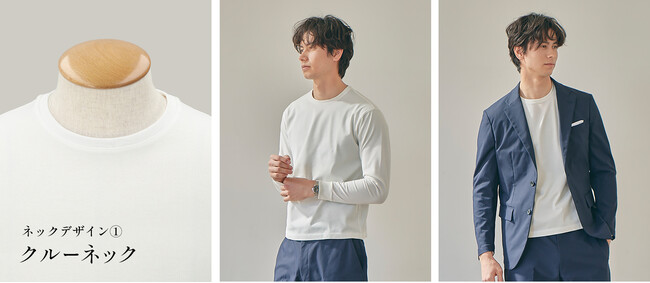 <クルーネック>定番のクルーネックはほどよく襟元を詰め、リブを細めにすることでドレッシーに仕上げました。