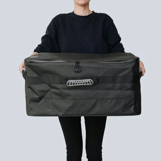 ランタンやバーナー等のハード機材から寝袋やマット等のソフト機材まで入る他、多少入れ過ぎても閉まるフレキシブル構造。