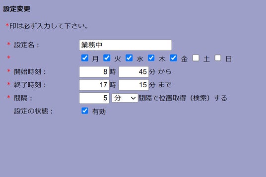 従業員のプライバシーにも配慮定期位置情報を取得する車両毎に稼働時間(曜日と時間帯)を指定でき、指定された時間以外の位置情報は取得しません。また、スマホのアプリを終了しておけば、位置情報は発信しないので、プライバシーには配慮された設計になっています。