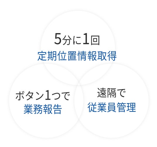 従業員が持っているスマートフォンにアプリをインストールするだけで、管理者様はPCなどで従業員の位置を確認できる様になり、運送業、保守・メンテナンス、訪問介護、営業など業種・業務問わずご利用いただけます!
