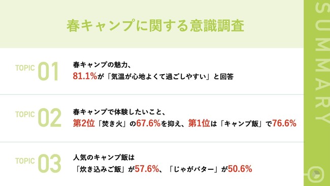 今回の調査では、ベテランキャンパー達にとって、寒さが和らぎ、過ごしやすくなった春に、キャンプをする魅力をたくさん感じていることが分かりました。朝晩は冷え込むことがあるものの、虫が少なく、過ごしやすい季節である春に、キャンプデビューしてみてはいかがでしょうか。