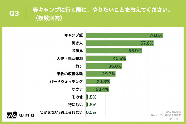 https://waq-online.com/ 春キャンプの魅力、「気温が心地よくて過ごしやすい」が81.1%で最多 「Q1.あなたが、春キャンプの魅力として感じるものを教えてください。(複数回答)」(n=111)と質問したところ、