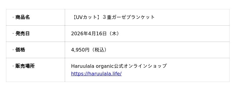 詳細を見る Haruulala organic はこれまで、赤ちゃんと地球環境のためにオーガニックコットン素材のベビー服・雑貨を展開してきました。しかし近年の厳しい猛暑と強い紫外線の中で、「天然素材の良さを活かしながら、さらなる機能性を」という声がユーザーや開発チームから高まっていました。