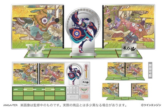 開閉可能な襖パーツを背景に、「薬売り」「天秤」「御札」「退魔の剣」「作品ロゴ」のパーツをお好みで飾れるアクリルジオラマ。