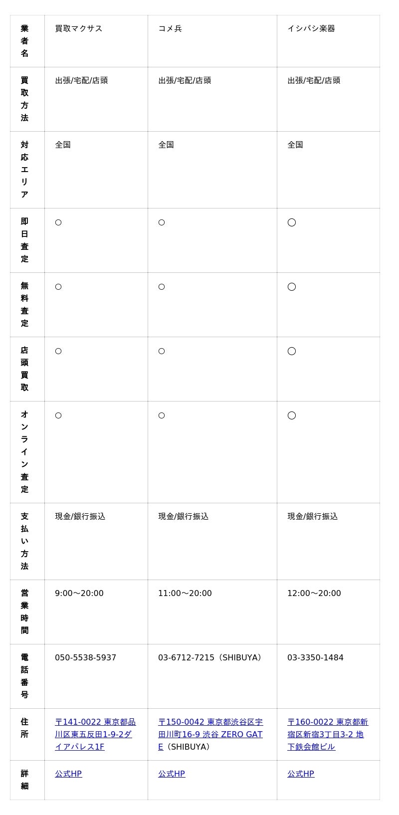 楽器買取におすすめの業者を8選ご紹介します。まずは、各業者の主要情報をまとめた一覧表から見てみましょう。