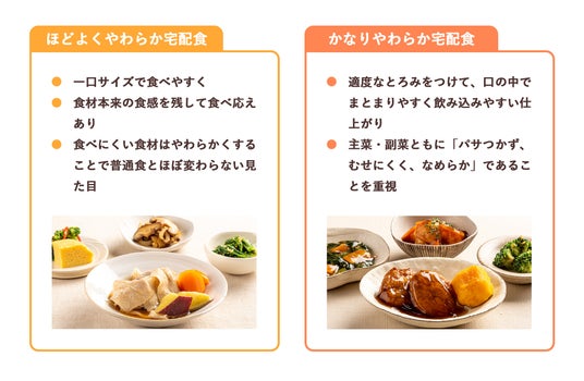 私たちはその気持ちに寄り添い、やわらか食を購入する際に直面する課題を解決するために、「ほどよくやわらか宅配食」と「かなりやわらか宅配食」の2種類をセットにしました。実際に食べ比べていただくことで、ぴったりのやわらかさを見つけていただけます。
