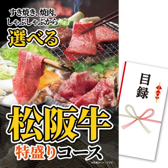 パネル付き目録 選べる松阪牛特盛りコース 22,000円(税込)人気ブランド牛の松阪牛をすき焼き、焼肉、しゃぶしゃぶの3種類から選べます。ご家族でも大満足の特盛りコースはインパクト大です。