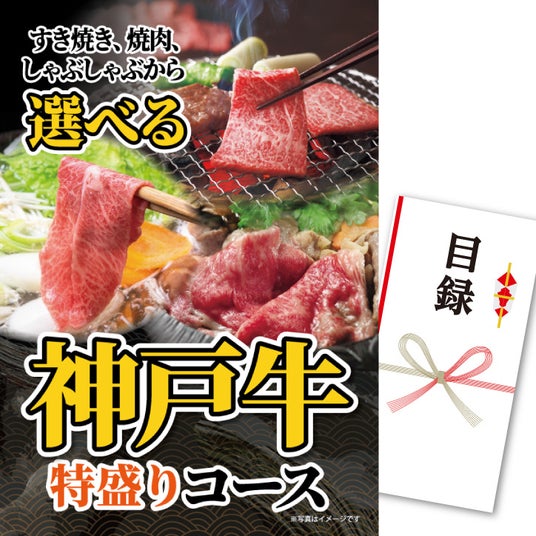 パネル付き目録 選べる神戸牛特盛りコース 22,000円(税込)人気ブランド牛の神戸牛をすき焼き、焼肉、しゃぶしゃぶの3種類から選べます。ご家族でも大満足の特盛りコースはインパクト大です。