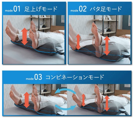 内蔵のエアバックが眠りを誘うリズムを刻む就寝前に動く足枕「エアテックフットピロー」で軽いストレッチを行う事により、入眠環境を整え質の高い睡眠をサポートします。足を乗せボタンを起動するだけで、エアバックが膨張収縮を繰り返し自動でお疲れ足をストレッチ。眠りを誘うリズムを刻み下半身をリフレッシュします。