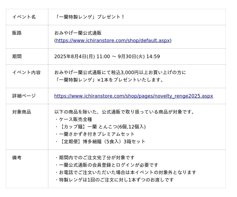 株式会社一蘭では2025年8月4日(月)~9月30日(火)の期間、おみやげ一蘭公式通販にて「一蘭特製レンゲ」をプレゼントする特別イベントを開催いたします。