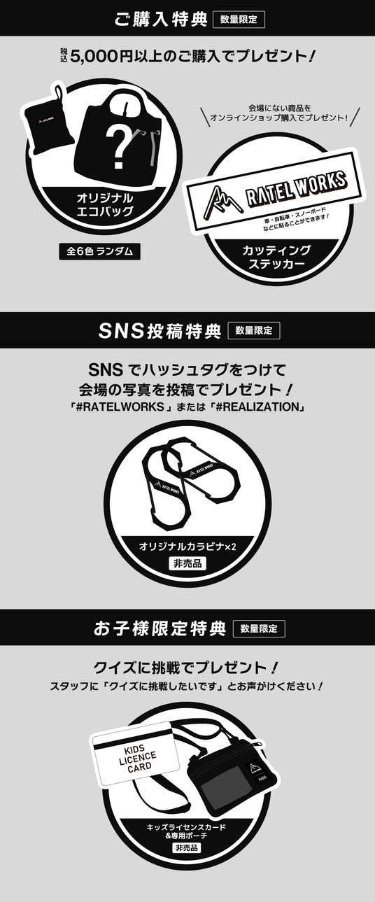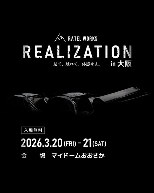 アウトドアブランド「RATELWORKS(ラーテルワークス)」は、2026年3月20日(金)・21日(土)の2日間、大阪・マイドームおおさかにてブランド展示イベント「REALIZATION in 大阪」を開催します。