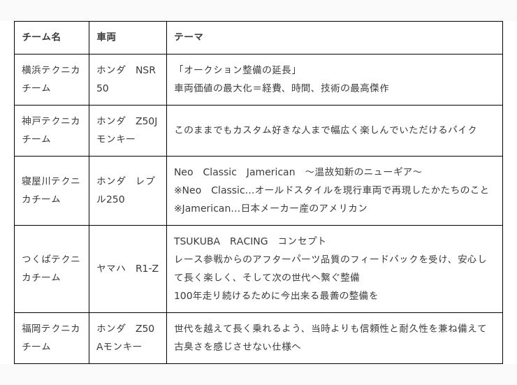 各チームの選定車両とテーマは以下の通りです。