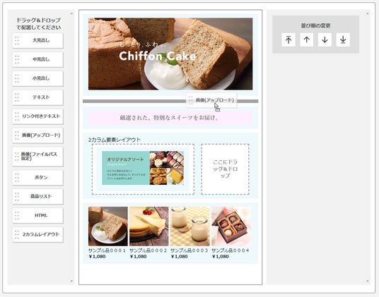 ■メルカートの「ノーコードCMS機能」について・専門的な知識を必要とせず、デザイン性の高いコンテンツの作成が可能に通常、デザイン性のあるウェブページを構築するには、HTMLやCSS、JavaScriptなどを用いたコーディング作業が必要です。今回、メルカートにおいて提供を開始する「ノーコードCMS機能」ではドラッグ&ドロップやビジュアルエディタなど、簡単な操作で容易にテキストや画像の追加、レイアウトの変更などができるようになりました。そのため、専門知識を必要とせず、誰でも簡単に短時間でコンテンツを作成でき、メルカートのあらゆるCMS機能において作業効率を大幅にアップすることが可能になりました。