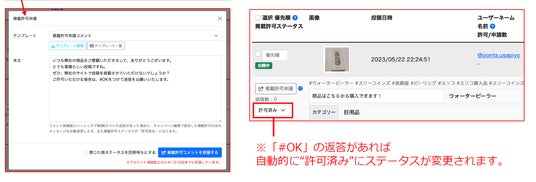 また、サイトへ載せる許可を取りたい場合、ハッシュタグ収集したお客様の投稿コメントに「投稿掲載許可申請」を管理画面から送ることが可能です。「OK」の返事があれば自動的に「許可済み」というステータスへ変更します。