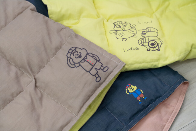 「おはよう朝日です」とのコラボならではのキャラクターイラスト入り!印刷にも職人の技術が光ります かめかめDownKetの裏表には「おはよう朝日です」の大人気キャラクター「ネムりん」のイラストが印刷されています!今回、印刷に協力してくれたのは、製版業に携わって50年以上の「増田染型株式会社」。「京都金桝」と同じ京都府亀岡市の老舗企業です。数量限定生産のわしぱん画伯による特別イラスト入りバージョンも、たしかな技術で、鮮明に印刷していただきました。