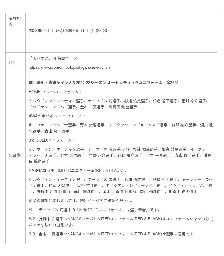 【滋賀レイクス 2022-23シーズン スペシャルオークション 第1弾概要】