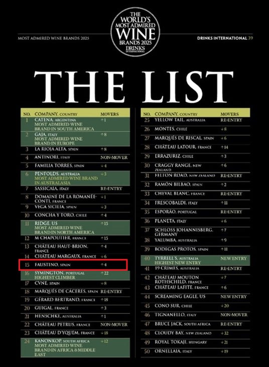 世界的な人気を誇るリオハワイン『ファウスティーノ』がイギリスの酒類専門誌「ドリンクス・インターナショナル」が発表した「世界で最も称賛されるワインブランド 2025」において見事ランクインいたしました。