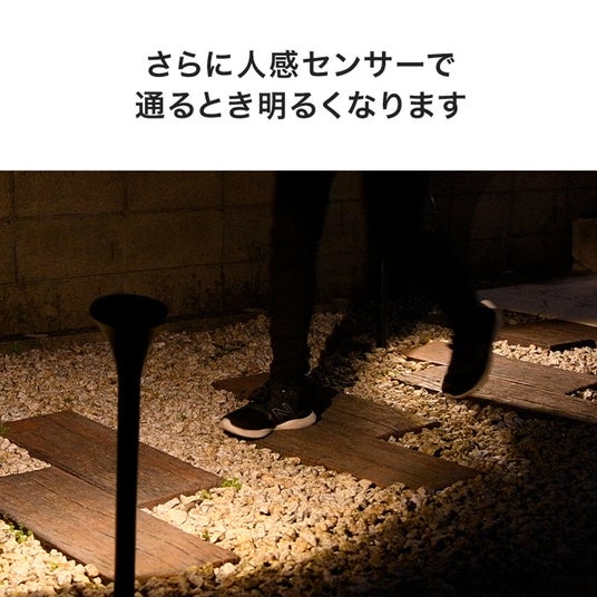 人感センサー搭載のポール型ソーラーライト。家族の安全を守るため、家の外側を明るく照らします。家に帰るとき、足元が暗くてつまずいたり、ケガをしたりする危険を解消します。