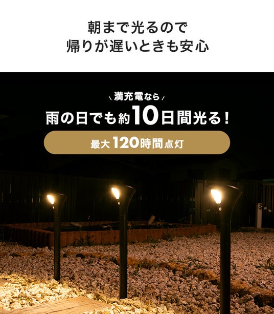 雨の日でも朝まで点灯できるので、帰りが遅いときも安心してご使用いただけます。