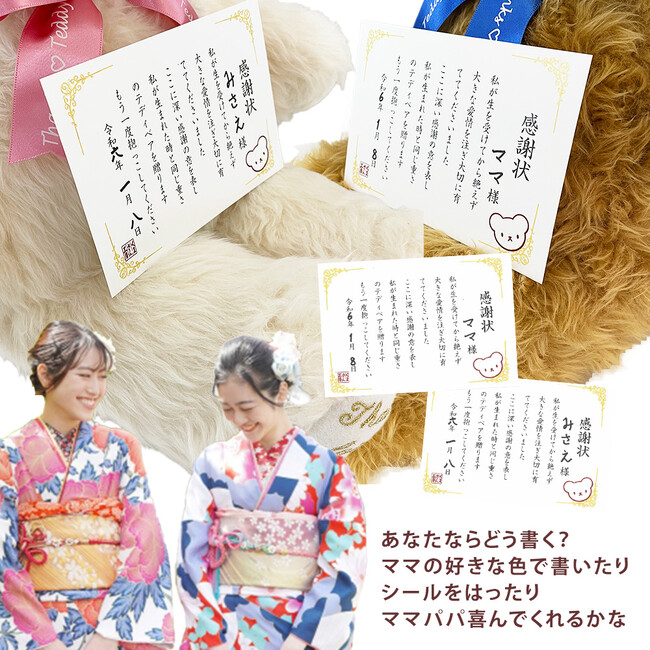 888円」でご提供します新成人、自由になるお金はあるものの、なかなかに厳しいお財布事情。新成人の消費意識は、節約第一を心がける堅実志向のよう。ママへの感謝ギフトもできればお値段をおさえたいところ。そこで「くまさん工房」では、Z世代新成人を応援するべく、特別な価格を設定。「くまさん工房」1番人気のスタンダードベアに、通常は別料金でお仕立する足裏の刺繍・ラッピングがセット。そして2024年成人式を迎えるあなたへの特別なアイテムとして、感謝・感動を演出する感謝状がつき、メーカー希望小売価格 21,230円のところ、お祝い価格8,888円(税込)でご提供します。