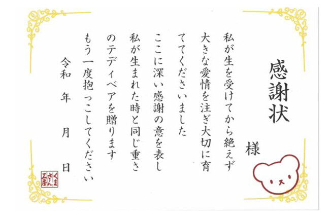 成人の日に、20年前の私を逆プレゼント!生まれた時の重さで作るテディベアでママパパに感謝を伝えます。「感謝状」がより感動を演出。Z世代の新成人に向けた特別な体重ベアのセット。12月1日受付開始https://prtimes.jp/main/html/rd/p/000000011.000043964.html■配信日:2023年12月1日 23時30分