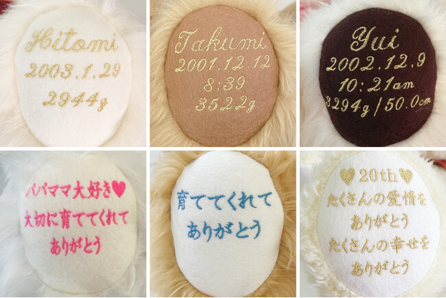5.両足に刻む刺繍つき・【左足】には出生のデータを刻みます。「お名前・生年月日・出生時間・体重・身長」の最大5項目。