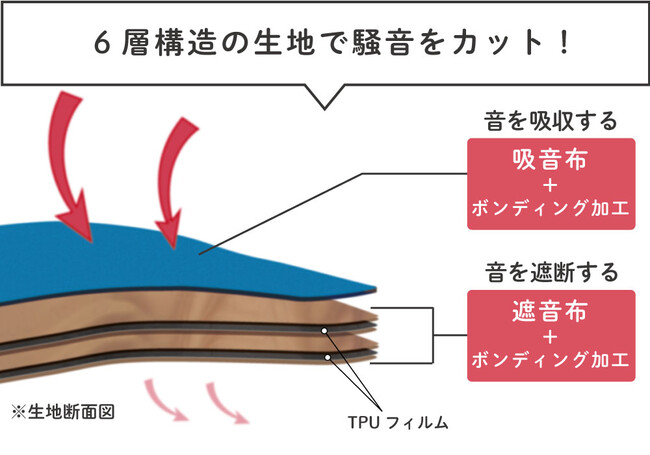 防音カーテンコーズ Natural(ナチュラル)は、音を吸収する「吸音布」と音を遮断する「遮音布」を組み合わせて作られています。