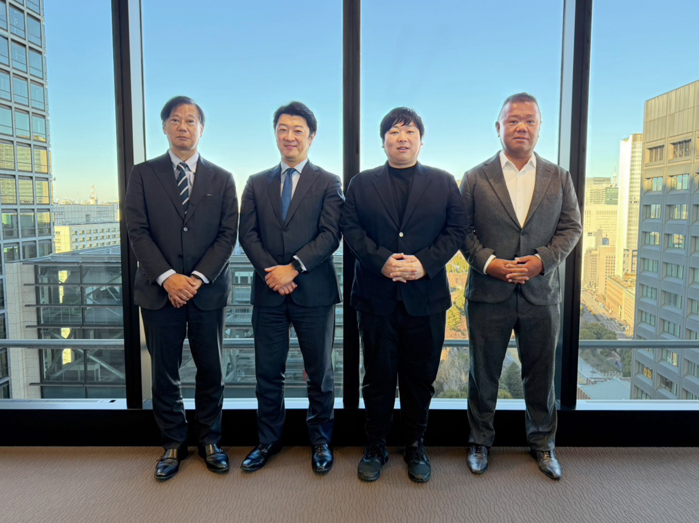 左から三井物産流通グループ株式会社 執行役員 フード&パッケージングユニット 業務用食材本部長 崎浜敬、三井物産流通グループ株式会社 取締役専務執行役員 フード&パッケージングユニット長 松岡大志、株式会社シコメルフードテック 代表取締役社長 川本傑、株式会社シコメルフードテック 取締役CFO 室木達哉