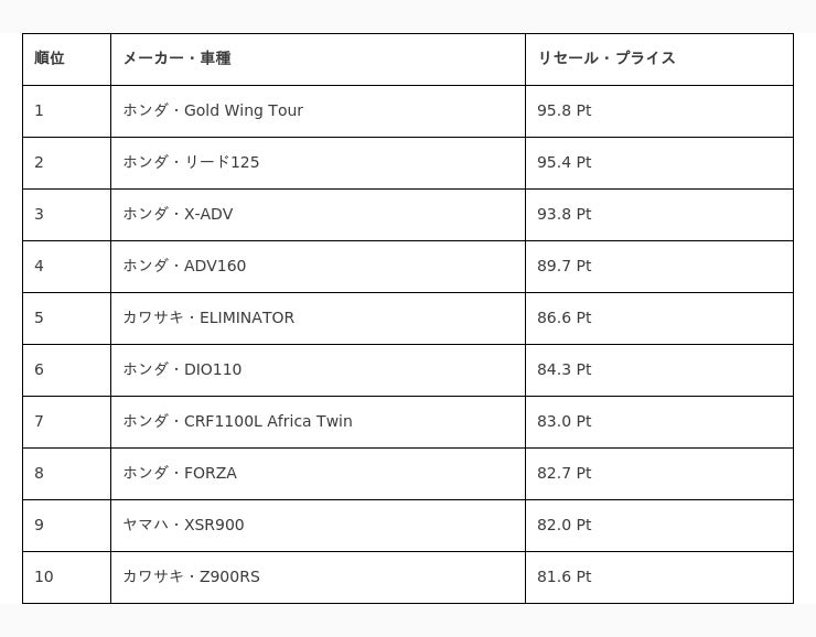 https://www.8190.jp/bikelifelab/bikefuture/resale-ranking/newest/■『リセール・プライス』とは バイクを再び売却(=リセール)するときの価格(=プライス)を指します。