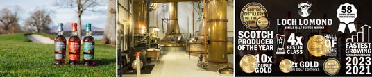 スコットランド最大の湖「ローモンド湖」の畔に位置しており、ハイランドに分類されます。現在の場所での蒸溜は1966年からですが、蒸留所の歴史は1814年にまでさかのぼることができます。2タイプの単式蒸留器、2タイプの連続式蒸留器、製樽工場が同一敷地内にあることが大きな特徴で、シングルモルト、シングルグレーン、ブレンデッドといったあらゆるウイスキーが造られておりまた、多彩な原酒を造り分けにより、複層的でバランスのとれたウイスキーを生み出しています。なお、ロッホローモンドウイスキーは「全英オープンゴルフトーナメント」唯一の公式ウイスキーで、各大会に合わせたスペシャルウイスキーの発売で大会を盛り上げています。2024年はIWSC「ディスティラリー・オブ・ザ・イヤー」の栄誉に輝き、数々の世界的品評会で過去最多58のアワードを受賞。