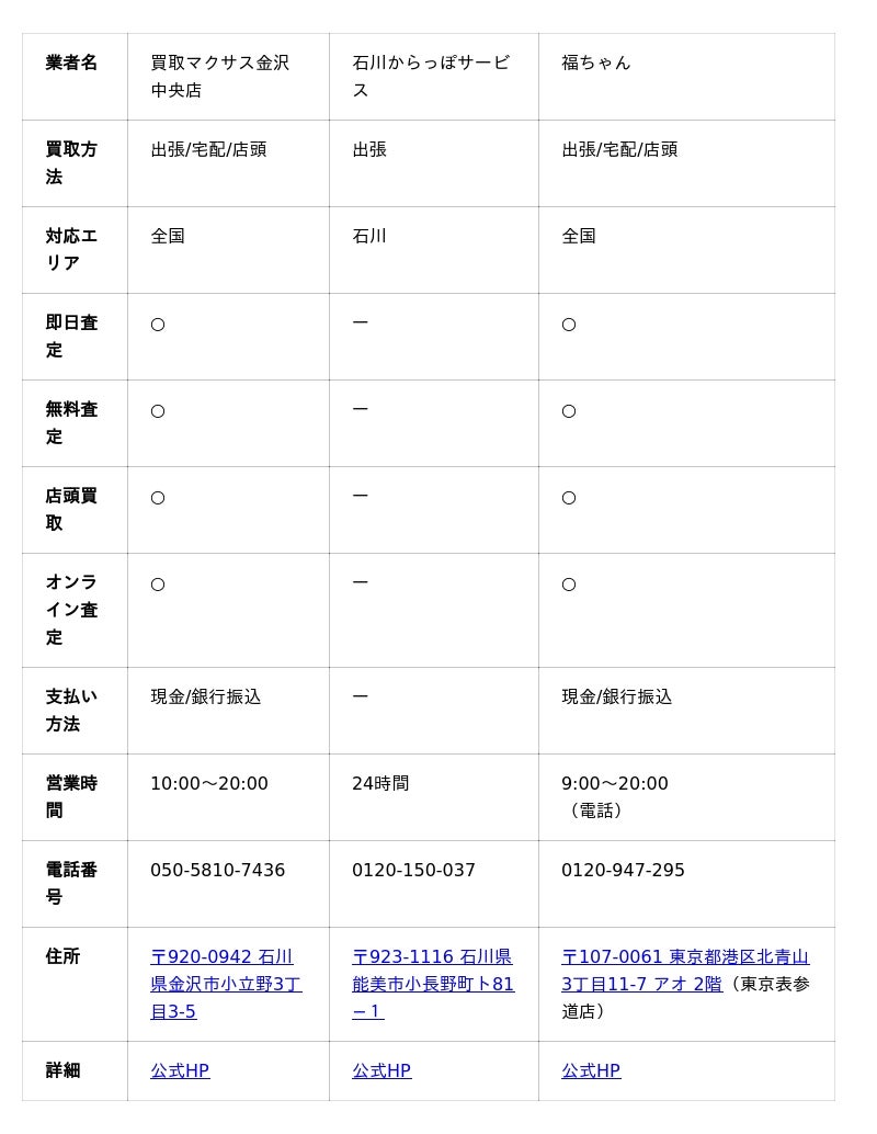 まとめ金沢市を対応する出張買取業者は数多くありますが、それぞれ買取品目が異なり、サービス内容やも異なります。本記事で紹介した出張買取業者は出張料無料で対応する優良業者ばかりですが、中には出張費を別途請求する業者もあるため、利用時にはしっかり
