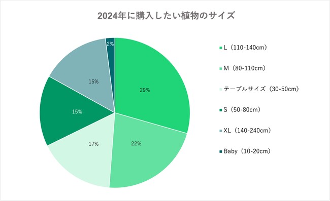 プランツニスタに対して「今年購入したい観葉植物の大きさ」を聞いたところ、「Lサイズ」という回答が29%で最多となり、続いて「Mサイズ」が22%、「テーブルサイズ」が17%、「Sサイズ」と「XLサイズ」がともに15%という結果になりました。サイズに関しては一人暮らしのご自宅にも取り入れやすいL、Mサイズが比較的人気という結果になりましたが、以降、Babyサイズ以外に大きく偏りが出ることはなく、部屋の広さや好みなどからさまざまなバリエーションで需要があることが分かりました。