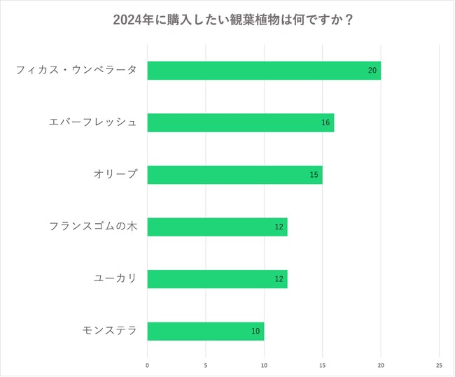 プランツニスタが「2024年に購入したい観葉植物」を質問したところ、TOP5は、1位「フィカス・ウンベラータ(20件)」、2位「エバーフレッシュ(16件)」、3位「オリーブ(15件)」、4位「フランスゴムの木(12件)」「ユーカリ(12件)」、5位「モンステラ(10件)」という結果になりました。 ※任意・自由記述で回答。