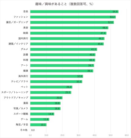 まずはじめに、アンケート回答者全体に対して「趣味・興味があること」について質問したところ、「音楽」が約55%、「ファッション」が約53%、「園芸/ガーデニング」が52%と、上位3項目は回答者の半数以上に当てはまる結果となりました。続く「美容」約49%、「映画」約47%を含めても、アンドプランツ利用者の「園芸/ガーデニング」以外での趣味・興味としては、トレンドやカルチャー、おしゃれに関する事柄が上位を占め、