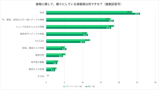 「植物に関して、頼りにしている情報源は何ですか?」の問いには、全体、プランツニスタともに「SNS」が全体の約1/4程度を占める結果となりました。