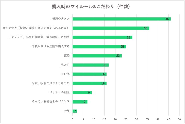 自由記述で回答が寄せられた、プランツニスタの「植物購入時のマイルールやこだわり」については、「種類や大きさ」に関するコメントが最多の46件(約19%)、次いで「育てやすさ」が36件(約15%)、「インテリアや部屋の雰囲気」が28件(約11%)という結果になりました。